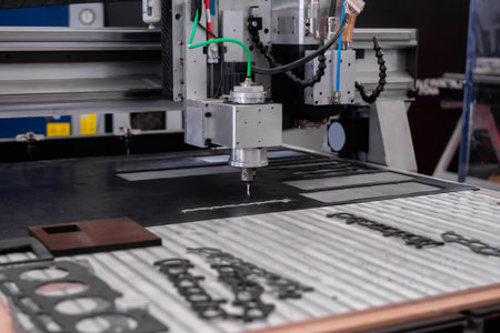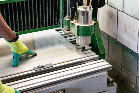 Close up of an industrial milling machine engraving a metal plate, utilizing a water cooling system to manage heat and ensure precision during the metalworking process