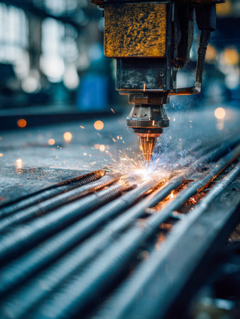Closeup Factory machine Laser CNC cut of metal with light spark industrial modern