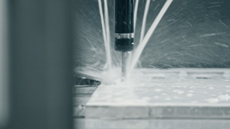Close up view of a milling machine carving intricate metal details, with water splashing around during the precise metalworking process in a modern industrial factory setting