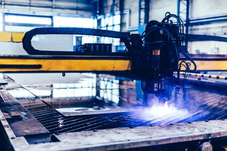 Plasma cutting of metal.The machine cuts iron with sparks.Industrial manufacture of products from iron sheets