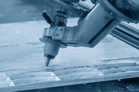 Close-up scene of multi-axis abrasive waterjet cutting machine cutting the aluminum plate. The high technology sheet metal working with CNC machine.