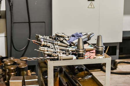 Mandrels and accessories for the CNC milling machine are located on the machine near the industrial equipment. Drills, cutters, cutters for metal processing.