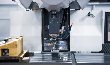 A modern 4-axis cnc vertical milling machine working with water cooling, selective focus on background