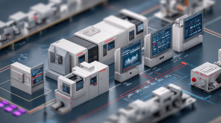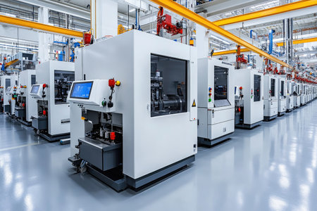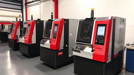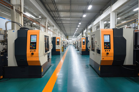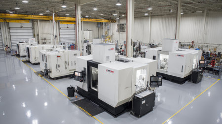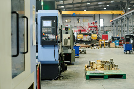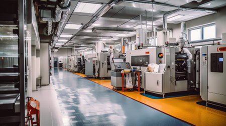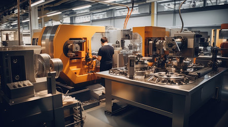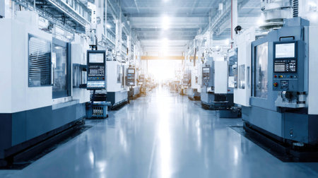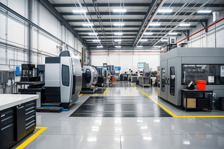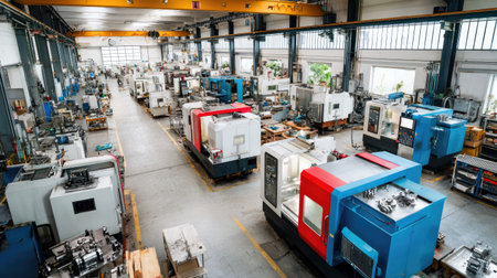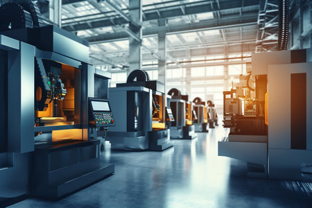 Interior Of Modern Engineering Workshop With Hi Tech CNC Machinery In Operation