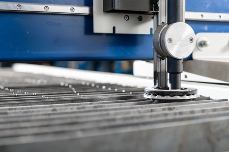 Industrial plasma machine cut of metal plate. New CNC Laser Plasma. Selective focus on laser plasma cutting of metal modern technology.
