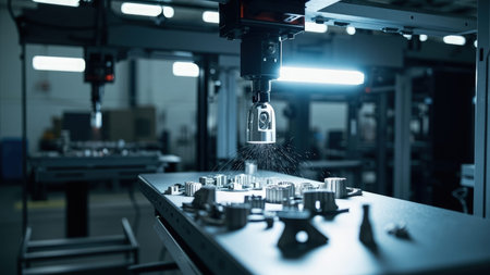 Modern industry high precision CNC machining center measuring workpiece. Industrial metalworking manufacture.