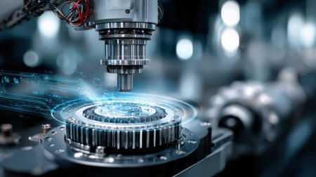 A close-up view of advanced industrial machinery with digital elements highlighting precision manufacturing processes. Ideal for showcasing innovation in modern industry.
