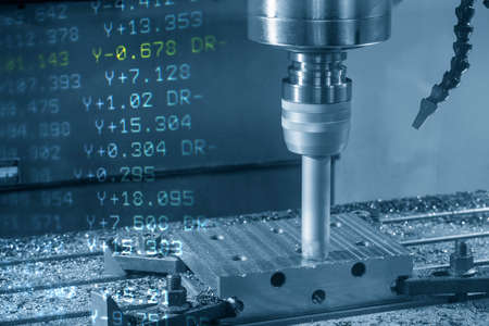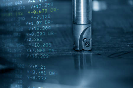 The abstract scene CNC milling machine cutting the mold and die parts and G-code data background. The mold and die manufacturing process by machining center with the solid endmill tools.