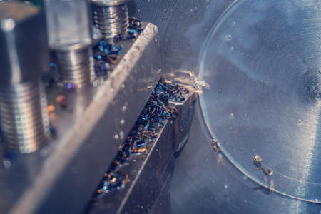 close up of the machine mechanisms in processing of metal product. Photo with depth of field