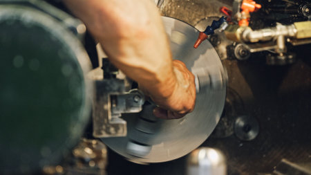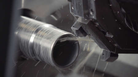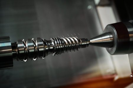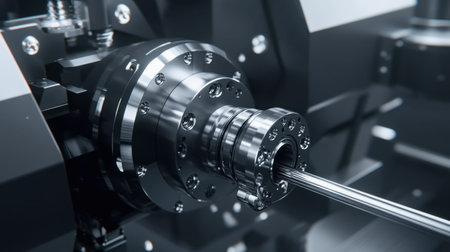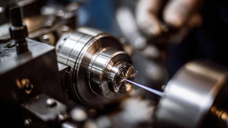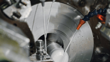 A close-up view of a high-speed machining process highlights the intricate details of rotating metallic components in a contemporary manufacturing setting.