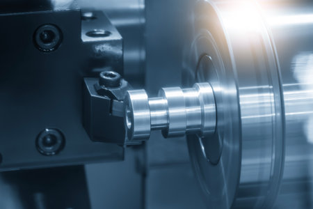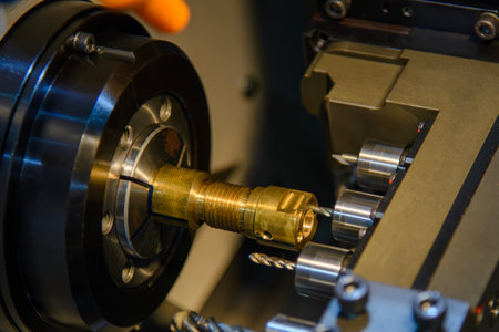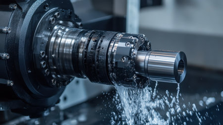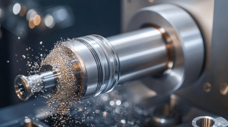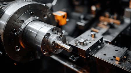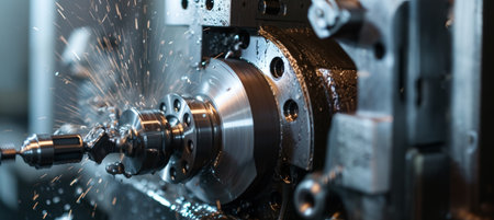 Close up view of a cnc lathe machine cutting a metal workpiece, highlighting precision and automation in the industrial metal production process. Showcasing advanced technology and engineering