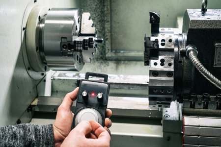 Engineer working on a CNC lathe machine in a factory
