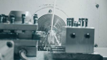 Coolant splashing onto a rapidly spinning metal piece during the precision machining process with a lathe machine in a bustling manufacturing plant, highlighting industrial efficiency
