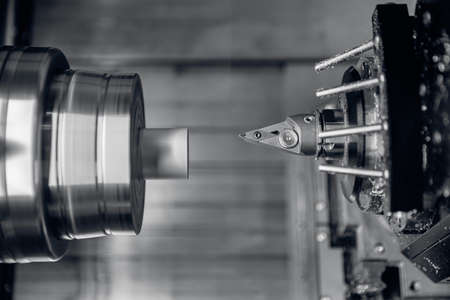 The CNC lathe machine forming cutting the metal shaft parts. The hi-technology metal working processing by CNC turning machine .