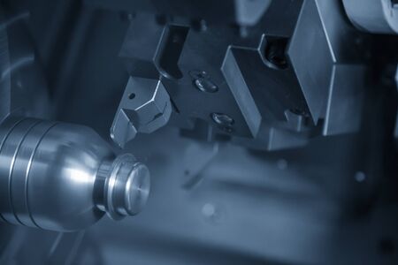 The CNC lathe machine finish cutting the metal shaft parts with cutting tools for make the automotive parts. The hi-technology metal working processing by CNC turning machine .