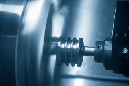 The CNC lathe machine groove cutting the pulley parts. The hi-technology metal working processing by CNC turning machine .