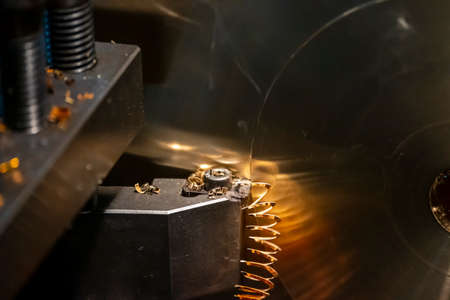 Closeup scene the lathe machine finish cutting the brass disk parts by lathe tools. The metalworking process by turning machine.