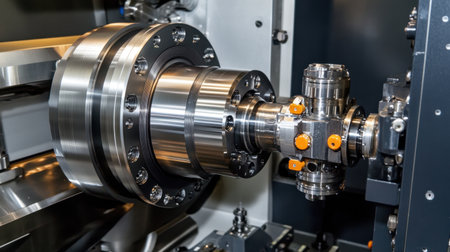 This image features a close-up view of a precision machined metal component situated in an industrial workshop. The vibrant lighting enhances the textures and details of the machinery, showcasing the elegance of engineering in a modern setting.