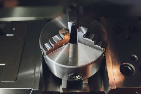 Lathe. Equipment for metal processing. Fragment of the machine for the processing of metal products. Fastening in a lathe.