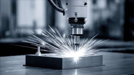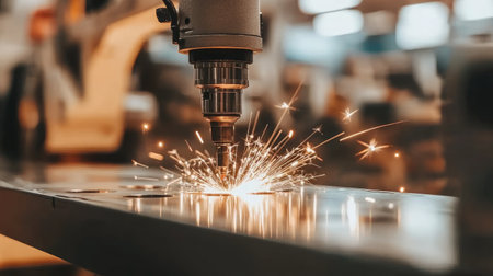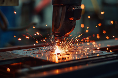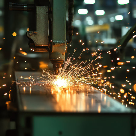 Sparks fly as a high-tech laser cuts through a metal plate, showing advanced engineering in a busy industrial setting.