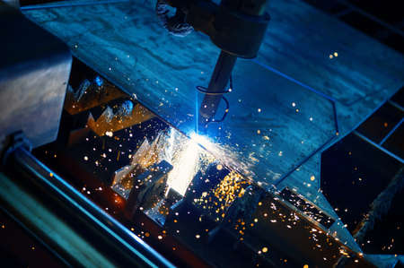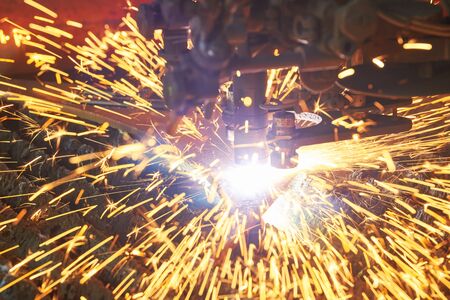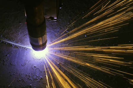 Sparks of plasma cutting machine, thick metal cutting, metal cut process, carpentry metalwork industry