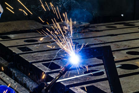 Welding steel structures and bright sparks in steel construction industry.