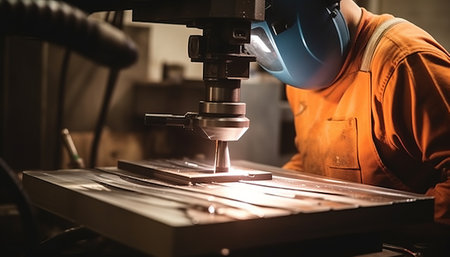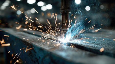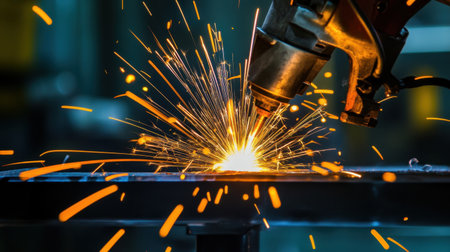 This dynamic image captures the intense moment of metal welding, showcasing sparks flying and a welding torch in action within an industrial workshop.