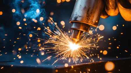 A vivid close-up image of a welding torch igniting sparks while working on a metal surface in an industrial workshop. The dynamic scene captures the energy and craftsmanship involved in the welding process.
