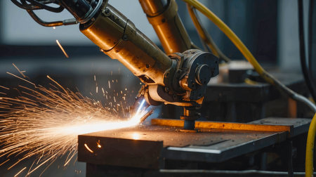 Robotic arm welding metal with sparks flying in an industrial setting.