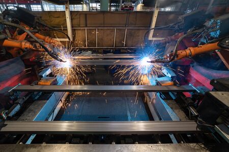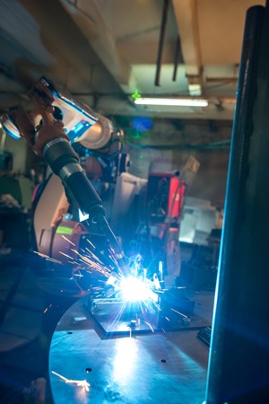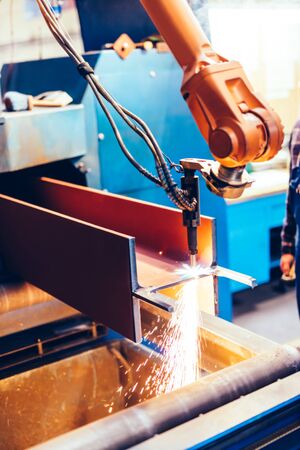 Welding robot, welds metal beams. Modern welding production. Bright flashes, sparks and smoke.