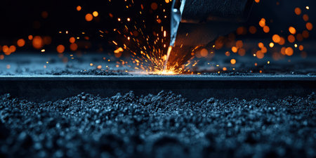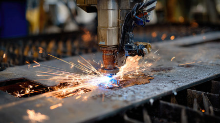 This image captures the fascinating moment of metal cutting, showcasing intense sparks generated by advanced machinery in an industrial workshop setting.