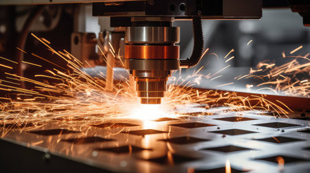 This image captures the dynamic process of laser cutting in an industrial workshop, showcasing precision and efficiency with bright sparks flying.
