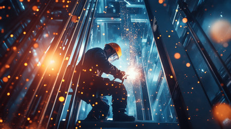 Bright sparks erupt from welding activity, creating a stunning display of light amidst a dark background, showing the intensity of the metalwork.