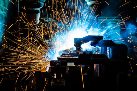 Robots used Metal Welding with sparks and smoke in manufacturing