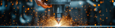 The image captures a close-up of a cutting tool in an industrial workshop, emitting sparks as it processes a shiny metal surface, reflecting craftsmanship and technology.