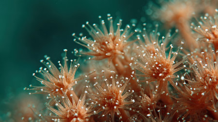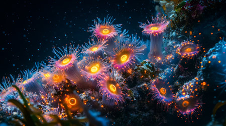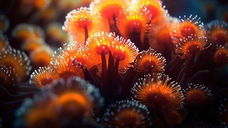 close-up of coral polyps capturing plankton in the dark, created with generative ai