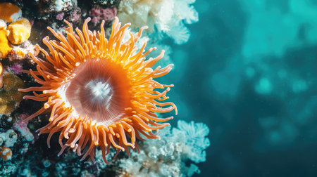 Top view of a sea anemone in its natural habitat, with a wide-open space on the right side for adding text or branding.