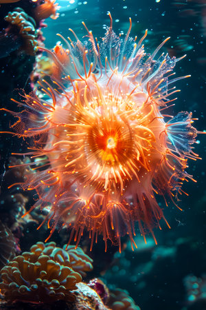 Vibrant Sea Anemone Illuminated in Underwater Seascape with Radiant Coral Reefs AI Generative