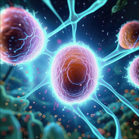 Intricate world of living cells in this closeup, showcasing glowing organic structures on a stunning blue background, revealing lives microscopic beauty