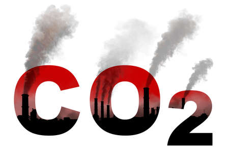Air pollution smoke from factory pipes. Industrial smokestacks. Smoke from factory chimneys, blue and dark sky and CO2 inscription from clouds. Environmental pollution. Waste production