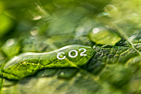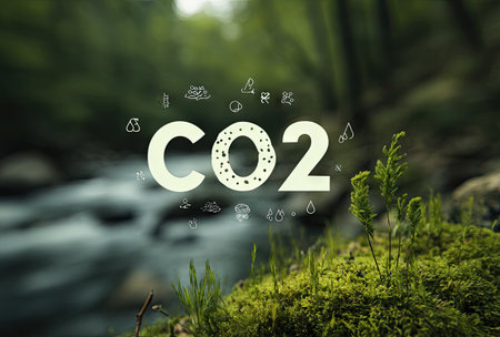 An artistic depiction presents the abbreviation CO2 superimposed over a blurred stream scene. The composition utilizes a verdant palette with natural light, emphasizing lush greenery. The image is designed to suggest environmental themes, suitable for a range of editorial and commercial applications.