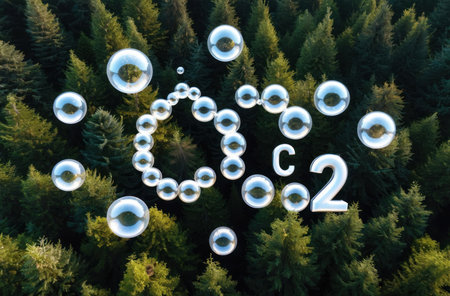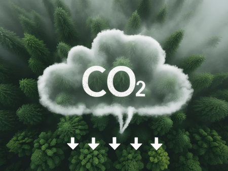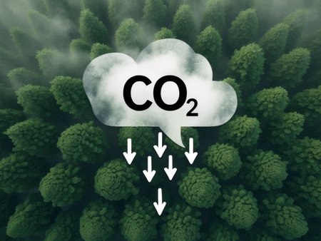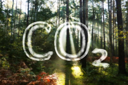Co2 letters made of forest and green leaf in the middle, representing nature absorbing carbon dioxide