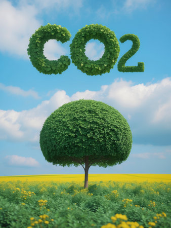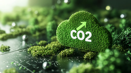 An image presents a globe covered in green vegetation, featuring a prominent CO2 symbol. The composition includes an array of environmental icons surrounding the Earth. The style is digitally rendered, with soft lighting and a focus on natural elements. This scene may be suitable for illustrating environmental concerns or sustainable practices.