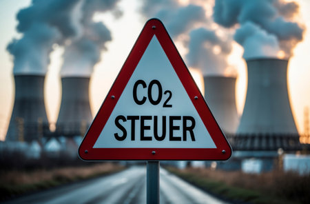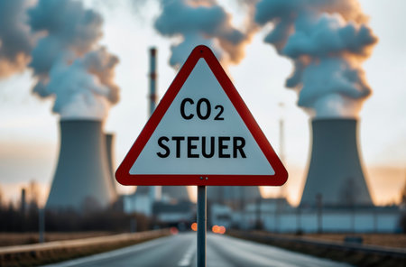 A red warning triangle with the German words - CO2 tax (CO2 tax) in front of industrial chimneys emitting thick smoke. The image underscores the urgency of carbon pricing as a tool to address pollution and the climate crisis. It visually connects industrial emissions with policy action.