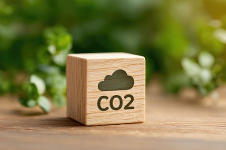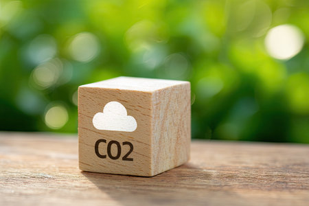 A wooden block, displaying a cloud icon and the letters 'CO2', sits on a wooden surface against a backdrop of blurred green foliage. The close-up shot uses natural lighting, highlighting the block's texture and detail. This image could be used for various projects related to climate change, environment, and sustainability.
