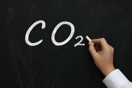 Reduce carbon emissions. Woman writing chemical formula CO2 on blackboard, closeup