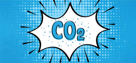 Cartoon, comic CO2 Warning emissions in cloud. vector logo. Carbon emissions reduction dioxide formula. Smog pollution environment combustion concept. Save the world or planet. Reduce, blue water.
