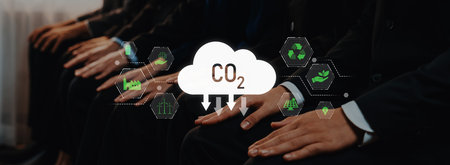A group of business professionals sit together, focusing on environmental issues. Carbon reduction and sustainability strategies emphasized through visual elements and hands.