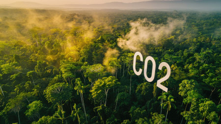 A birds eye view of a lush forest with a prominent CO2 sign, symbolizing the importance of carbon dioxide levels in the ecosystem.