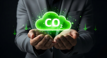 Man holding glowing green C O2 cloud with downward arrows carbon dioxide